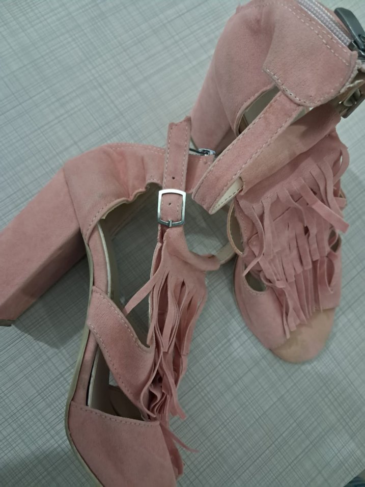 Pembe süet, tokalı ve püsküllü kadın topuklu ayakkabı. Bohem tarzı ve baskılı deseni ile günlük kullanıma uygun.