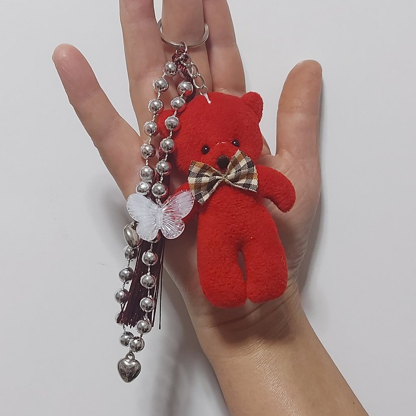 Kareli papyonlu kırmızı peluş ayıcık, püskül, gümüş boncuklar ve kelebek süslemeli renkli anahtarlık ve Çanta Charm.Rahat ve bohem tarz için uygun.