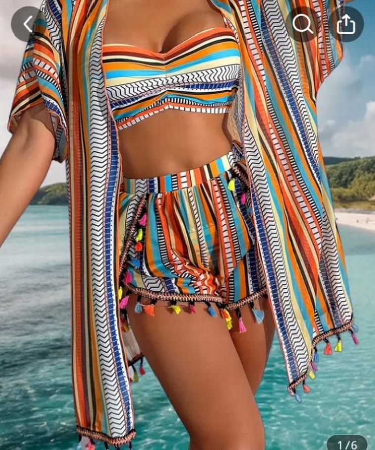 Kadın mayo, bol kesim ve mini kısa boyda, renkli batik desenli. Askılı ve püsküllü detaylarla bohem, retro tarzda, plaj için uygun 4parça dır 1defa kullanıldı . çok kaliteli