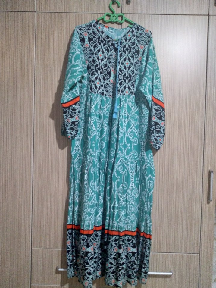 Turkuaz renkli, uzun kollu ve yuvarlak yakalı, bol kesim bohem tarz elbise. Renkli batik desen ve püskül detaylarıyla günlük kullanıma uygundur.