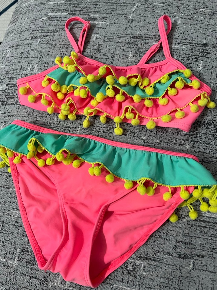 Renkli kız çocuk bikini, askılı üst ve püsküllü detaylarla plaj için uygun, pembe ve yeşil renklerde.