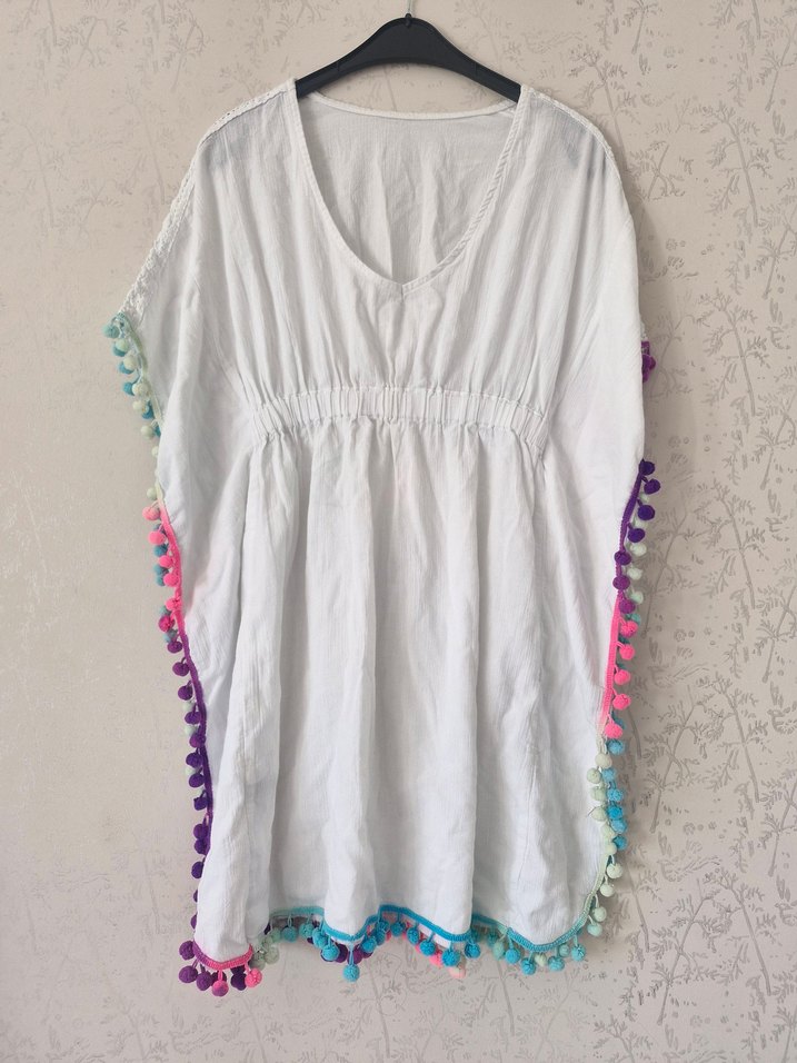 Pamuklu, uzun ve bol kesim tunik, V yaka ve kolsuz. Kenarlarında renkli püsküllerle bohem tarzı yansıtıyor.
