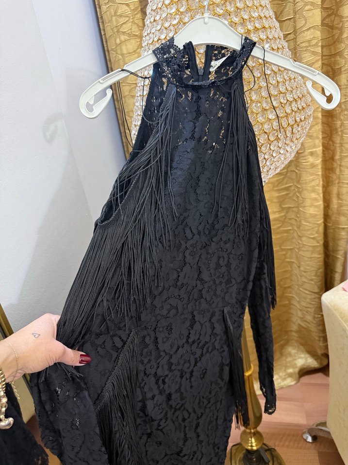 Dar kesim siyah abiye elbise, yüksek yakalı ve askılıdır. Nakışlı desenler ve püskül detaylarıyla düğünler için uygundur. omuz detaylarıyla birlikte çok şık bir abiyedir. S Xs uyumludur.