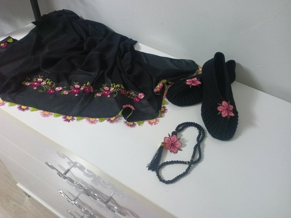 Püsküllü ve işlemeli çiçek detaylarına sahip siyah kadın atkısı, bohem ve retro tarzı yansıtıyor.