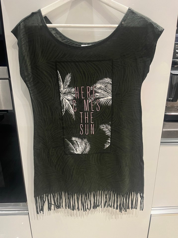 Siyah, kısa kollu, bol kesim plaj elbise baskılı desen ve etek kısmında püsküllerle bohem tarzı yansıtıyor.