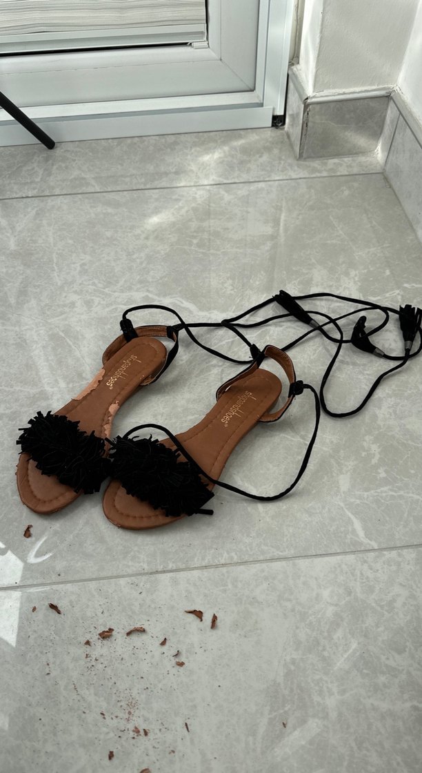 Siyah süet kısımları sağlam sadece taban kısmında soyulma var tamamen soyup kullanılabilir 1 kere giyildi. Püsküllü ve nakış detaylı siyah bohem stiletto topuklu sandaletler. Kauçuk malzemeden, bilekten bağlamalı, retro tarzda günlük kullanıma uygun.