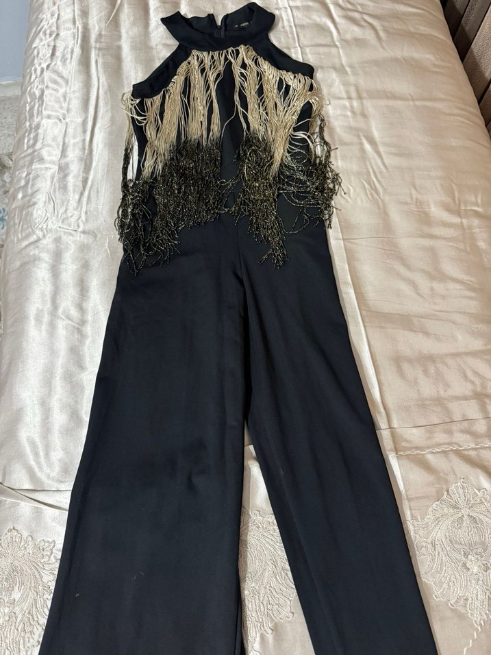 Siyah tulum, straplez yaka ve bol kesim. Püsküllü nakış detaylarıyla bohem ve avangart tarzda, parti için uygun. Kolsuz tasarım öne çıkar. ✨
