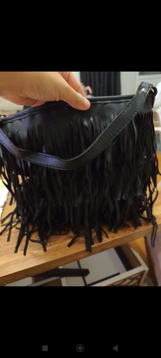 Püsküllü siyah deri bohem tarzda kadın çanta, parti için uygun, koyu ve desensiz tasarıma sahip.