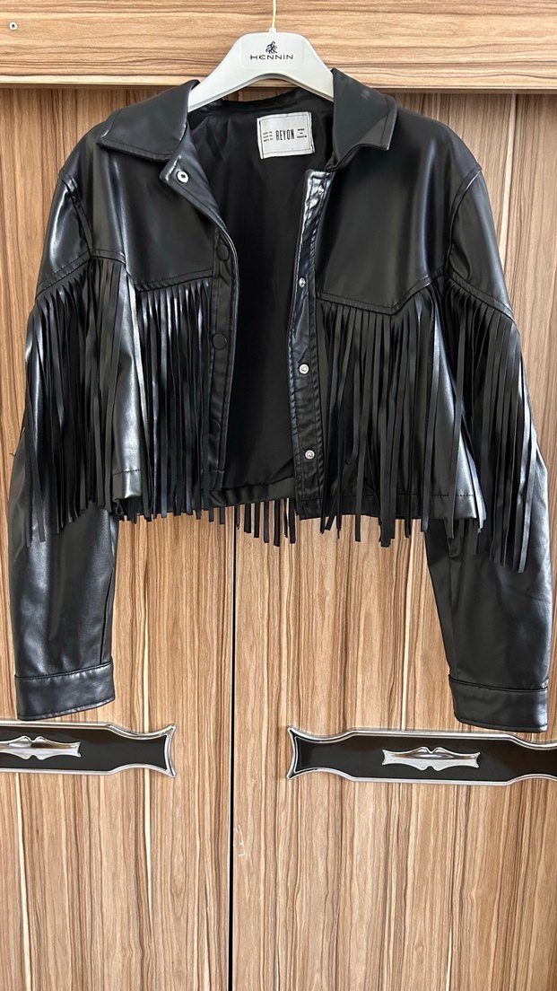 Siyah deri biker ceket, kısa boy, püsküllü ve askılı kollu tasarımıyla rock punk havası sunar. Regular fit ve kesik yaka detaylı, günlük kullanıma uygun.