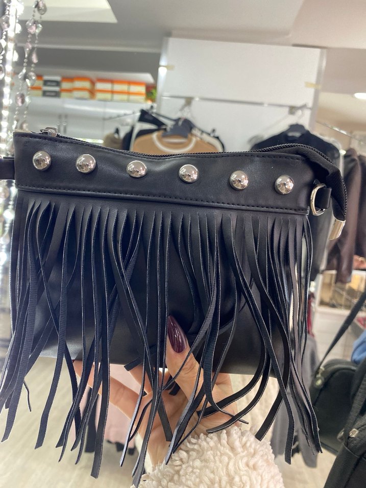 Püsküller ve metal zımbalarla süslenmiş siyah deri çanta, nakış detaylarına sahip. Grunge punk tarzını yansıtır, günlük kullanıma uygundur.
