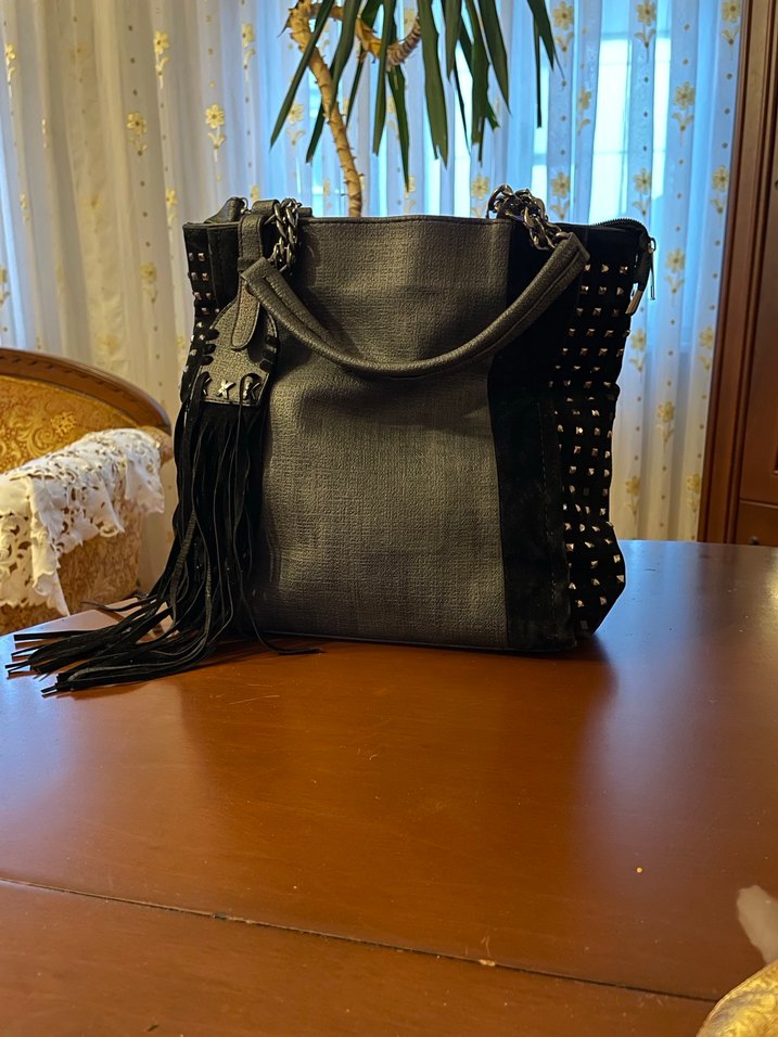 Siyah ve gri deriden, desenli yanları ve püsküllü detaylarıyla günlük kullanıma uygun gotik sokak stili kadın çantası.