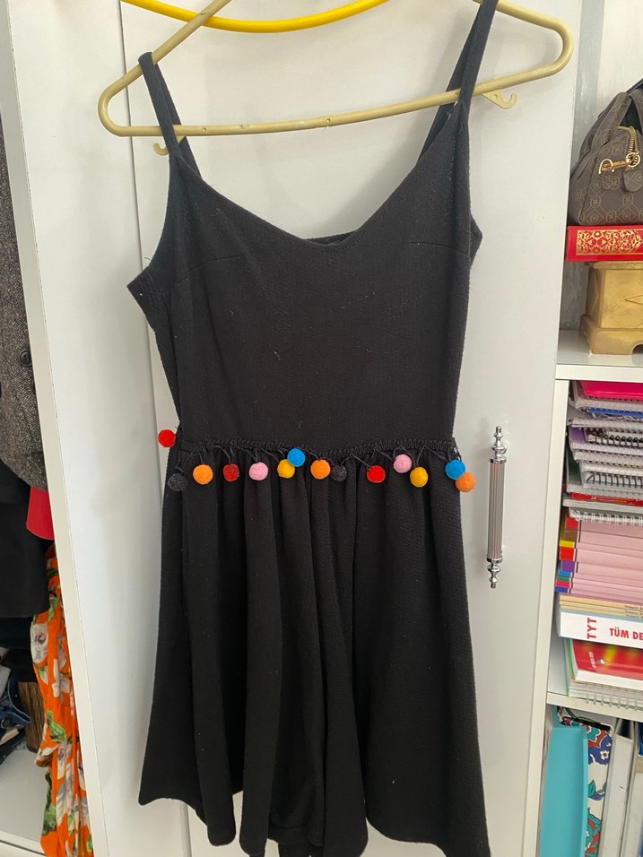 Siyah, ince askılı ve bel kısmında renkli püsküller bulunan, triko kumaştan yapılmış, straplez görünümlü ve midi boyda, fitted kesim kadın tulum. Bohem tarz için uygundur.