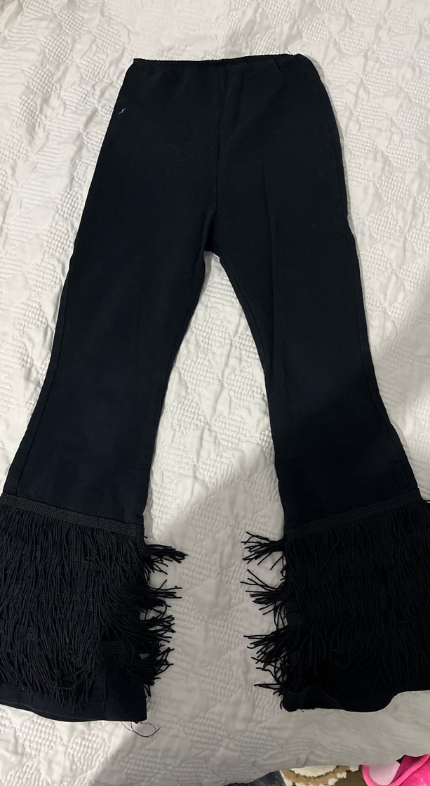Yumuşak sentetik kumaştan, püsküllü detaylı, ispanyol paça ve siyah renkli, rahat ve bohem tarzda kadın pantolonu.