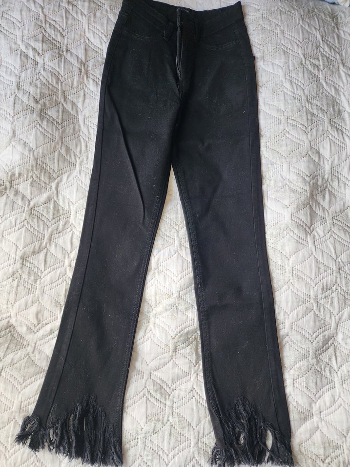 Siyah kadın jean, regular fit kesim ve püskül detaylarıyla. sokak stili ve günlük kullanım için uygundur.