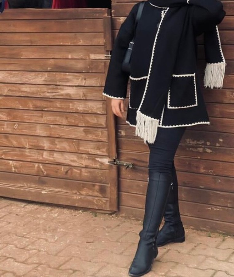 Püsküllü Siyah Kadın Midi Ceket
