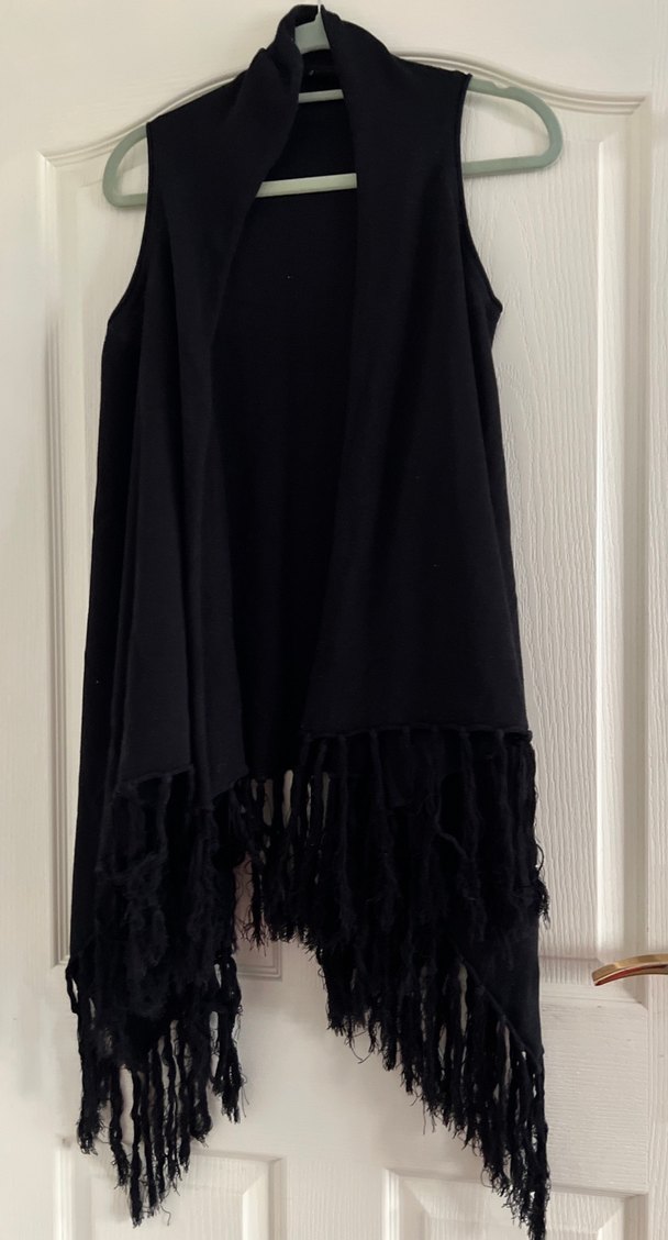 Püsküllü detaylara sahip, V yakalı, siyah kolsuz yelek. Rahat kesimli ve yumuşak sentetik kumaştan yapılmıştır. Goth ve bohem tarzına uygundur.