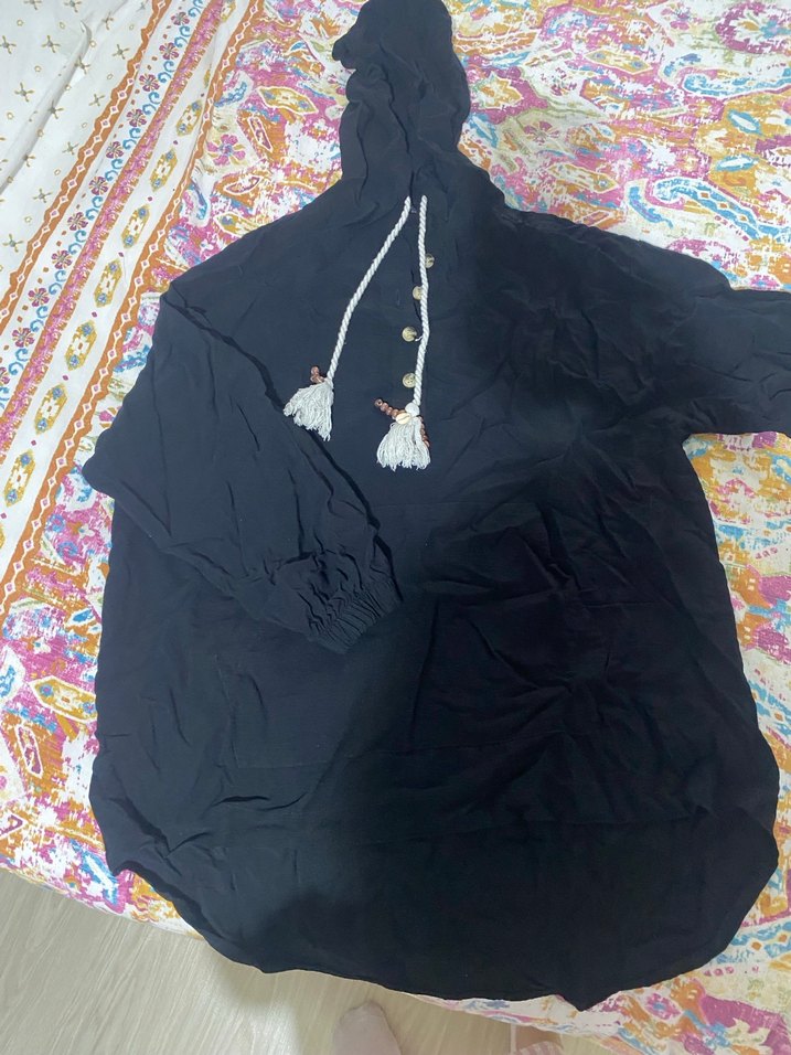 Siyah, uzun kollu, kapüşonlu ve püsküllü bluz.Bohem tarzda, bol kesim ve baskılı desenlidir, günlük kullanıma uygundur.