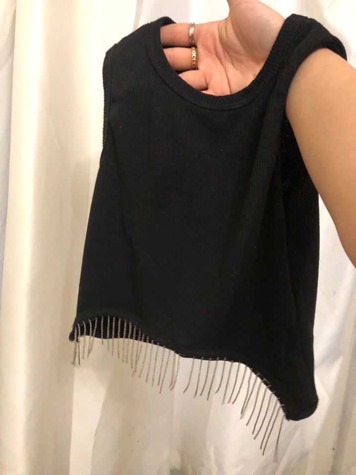 Siyah kolsuz crop top, yuvarlak yaka ve etek kısmında püskül detaylıdır. Gevşek kesim ve sentetik kumaştan yapılmıştır, günlük kullanıma uygundur.