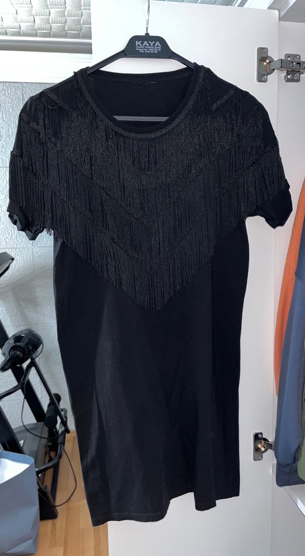 Siyah midi uzunlukta, kısa kollu, yuvarlak yakalı ve bol kesim bir triko elbisedir. Püsküllerle süslenmiş gotik tarzda, yumuşak sentetik kumaştan yapılmıştır.