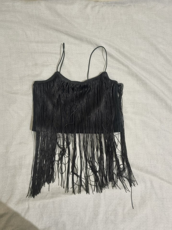 Siyah, ince askılı ve uzun püsküllü, sentetik kumaştan yapılmış mini, dar kesim bluz. Straplez yaka ve bohem tarzıyla parti için uygundur.
