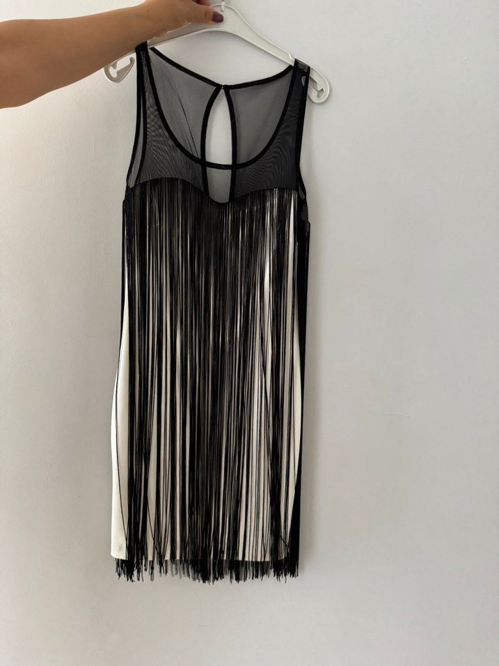 Kolsuz, püsküllü detaylı siyah mini gece elbisesi, vücuda oturan kesim ve şeffaf üst bedenle avant-garde parti stiline uygun.