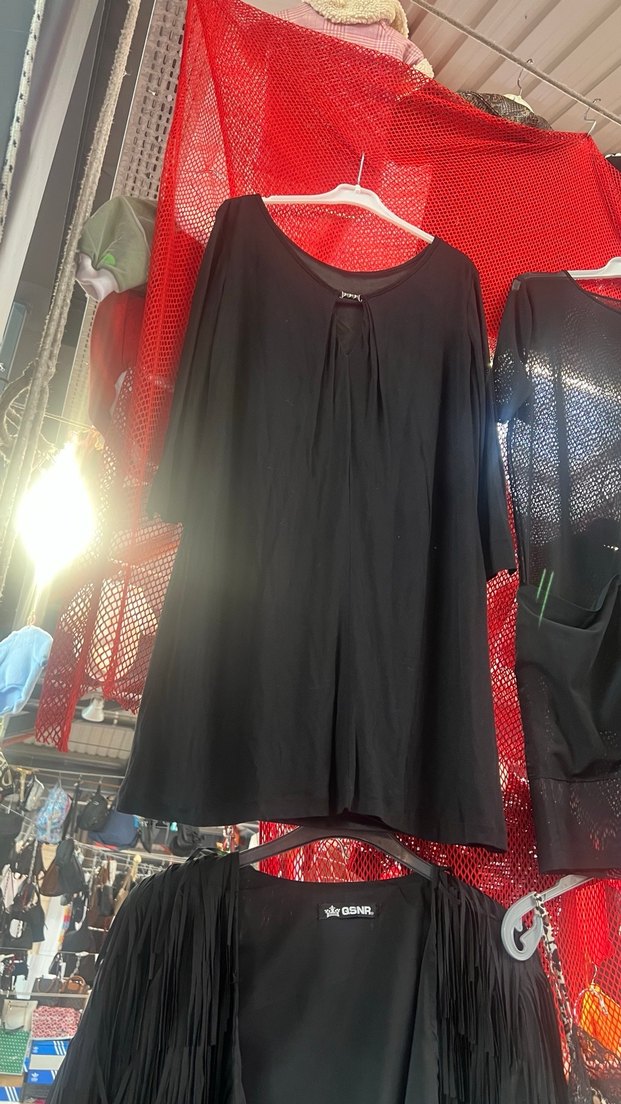 Siyah mini tunik, bol kesim ve uzun kolludur. Sentetik kumaştan üretilmiş, V yaka ve püskül detaylarına sahiptir. Gotik parti için uygundur.