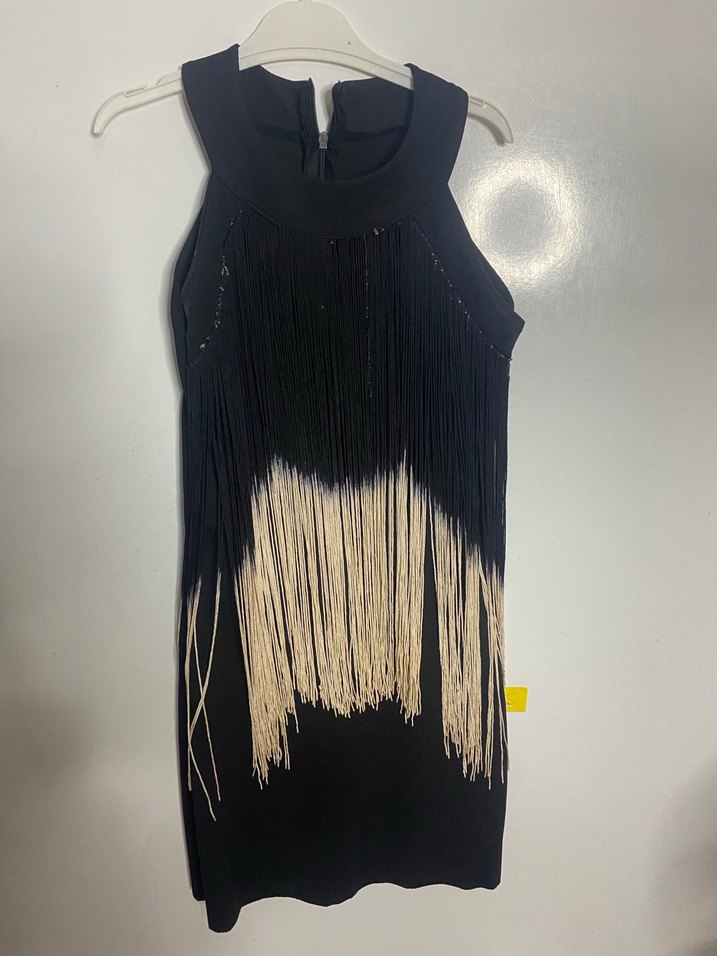 Bu siyah mini elbise, halter yaka ve uzun püskül detaylarıyla dikkat çekiyor. Avant-garde ve bohem tarzı yansıtan, parti için uygun şık bir model.