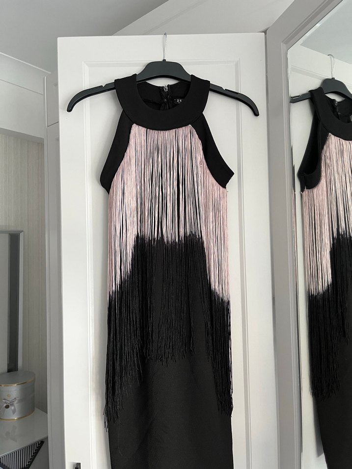 Bu siyah, dar kesim abiye elbise, halter yaka ve askılı kollara sahip olup, ombré püsküllerle gotik ve avangart bir stil sunar.