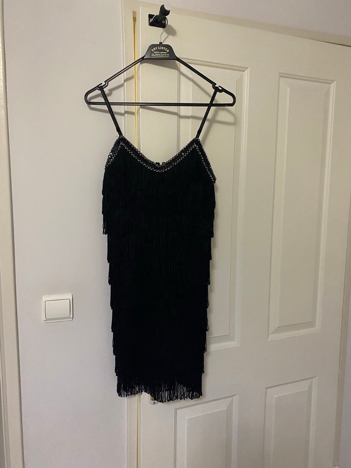 Siyah, v yaka, ince askılı, gövdeye oturan mini elbise. Püskül katmanları ve nakış detaylarıyla gotik ve bohem tarzda parti elbisesi.