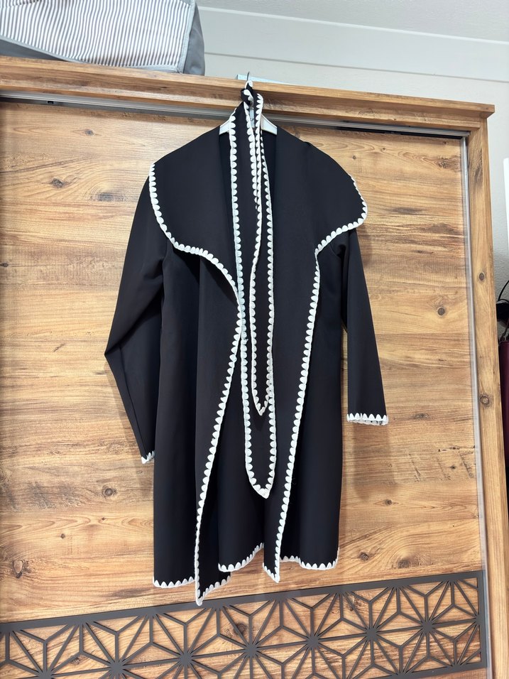 Püsküllü ve nakış detaylı siyah uzun kaban, uzun kollu ve rahat kesimlidir. Yumuşak ve sıcak kumaştan üretilmiş, günlük kullanım için uygundur.