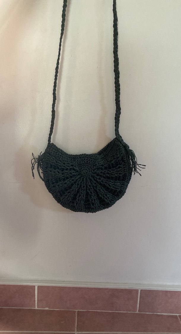 Püsküllü detaylara sahip siyah örgü çapraz çanta, bohem tarzıyla günlük kullanıma uygundur. Yumuşak dokusu ve desensiz yapısıyla retro hava katar.