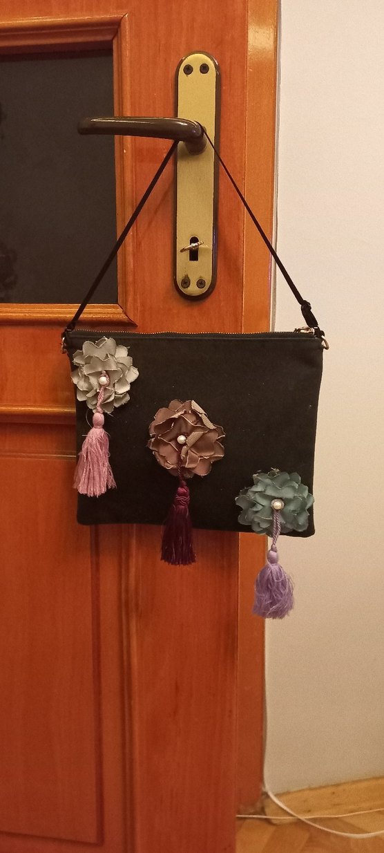 Siyah süet çanta, çiçek desenleri ve püskül detaylarıyla bohem tarzda, günlük kullanım için uygun. nostaljik işlemeli cluch çanta isteğe bağlı eklenen sapı çıkartabilirsiniz ürün sorunsuzdur 80ler marka temsilidir 25/21cm