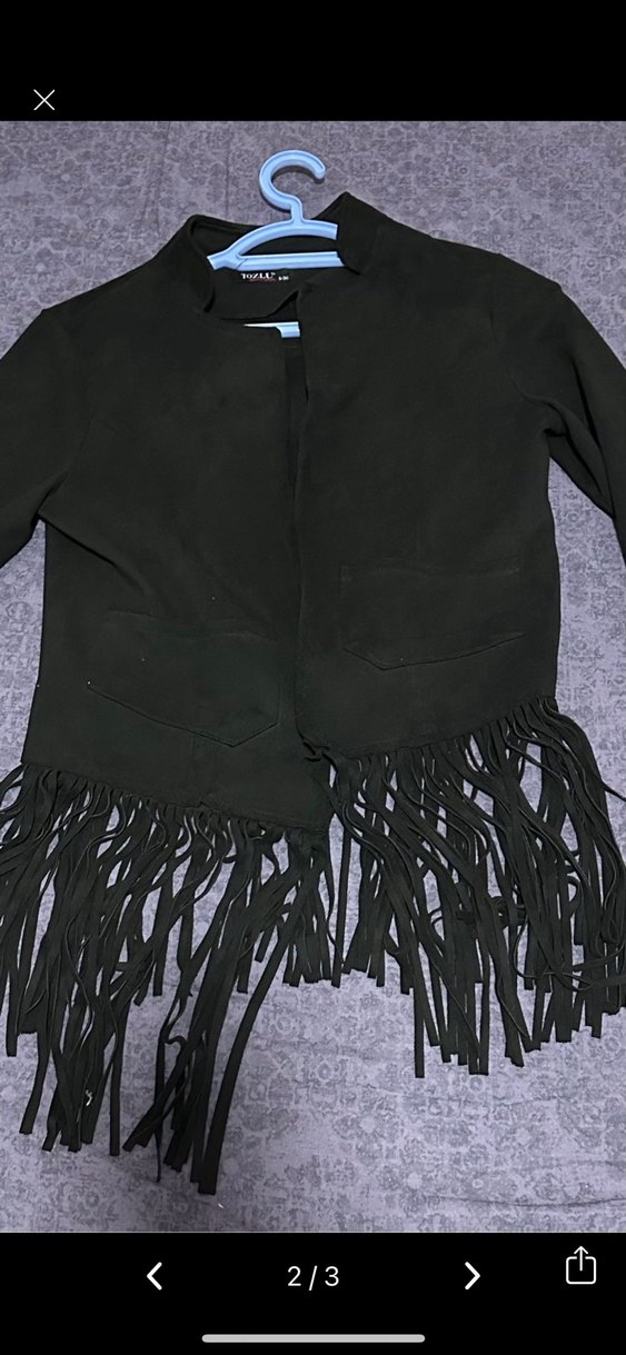 Siyah süet ceketin uzun kollu, oturan kesimi ve kesik yaka detayı vardır. Midi boyda ve alt kısmında püsküller bulunur, goth ve bohem tarzı bir arada sunar.