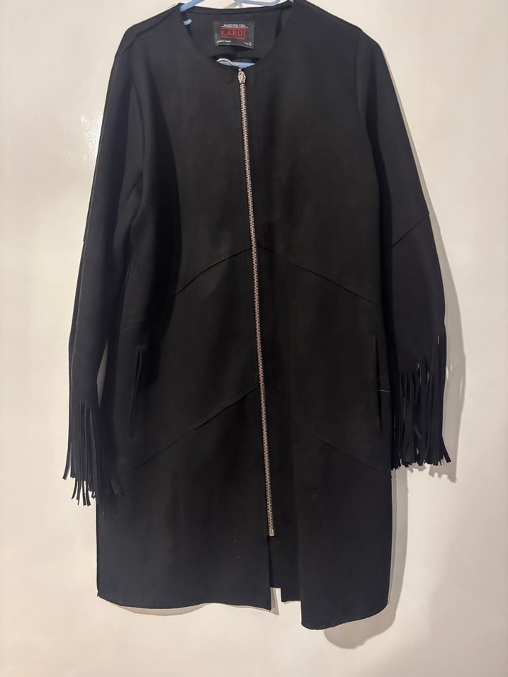 Siyah süet kadın ceketi, uzun kollu ve püskül detaylıdır, kesimi regular fit ve yaka tipi kesik yakadır. Uzun boyu ve desensiz tasarımıyla günlük kullanıma uygundur.