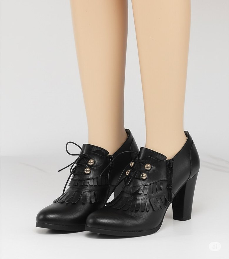 Siyah renkte, blok topuklu, püsküllü ve desenli kadın botu. ofis kullanımı için uygun, sadece on kisminda küçük soyuk var