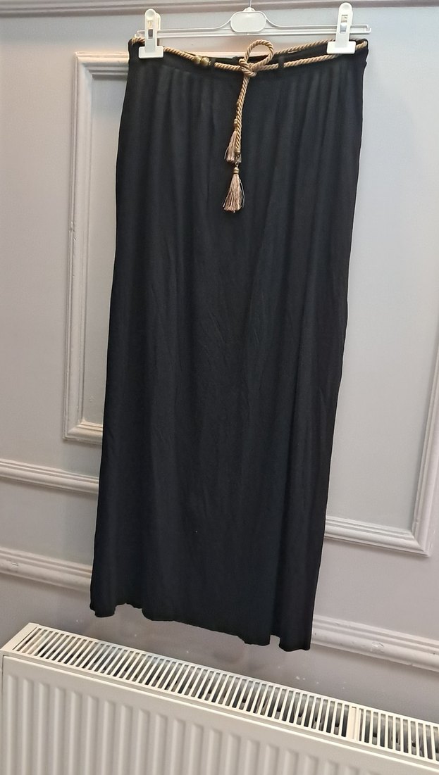 Siyah, uzun boy, bol kesim, ipeksi dokulu ve püsküllü detaylı bohem tarzda günlük kullanım için uygun etek.