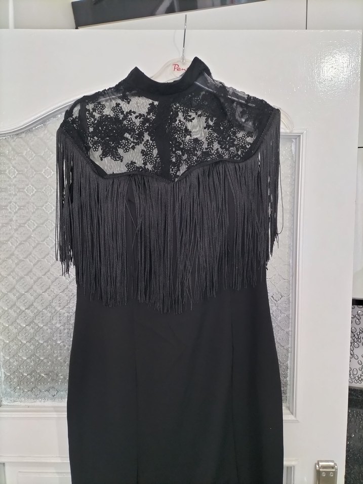 Siyah, uzun ve balık kesim kuyruklu elbise, dantel yaka ve püskül detaylarıyla 40 bedene kadar uyumlu şık abiye