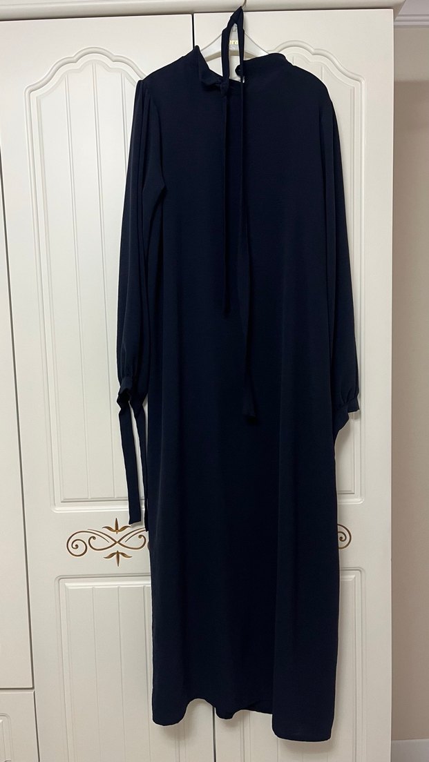 Siyah, uzun kol ve yüksek yakalı kadın elbisesi, bol kesim ve sentetik kumaştan. Püskül detaylarıyla minimalist gotik tarzda, ofis kullanımına uygun.