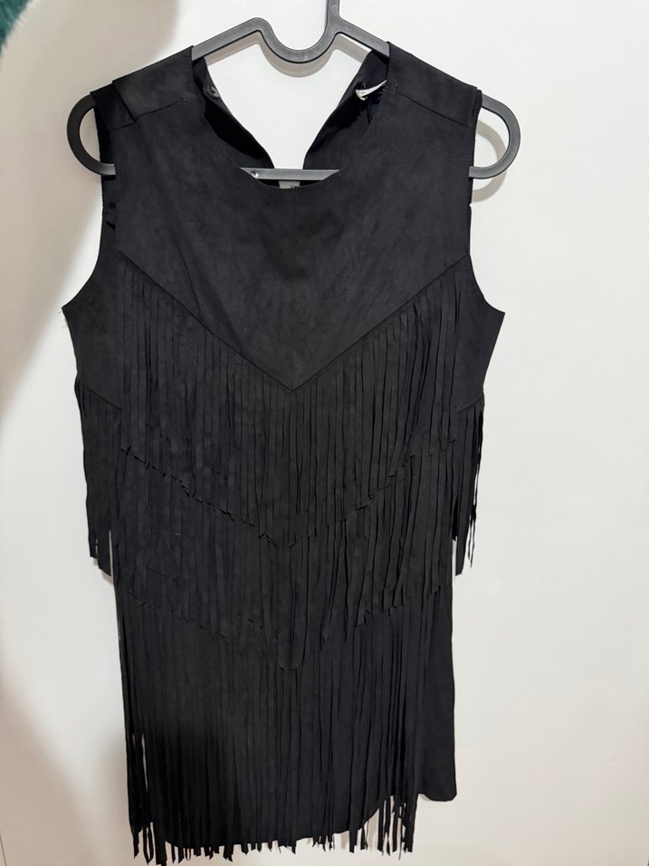 Siyah, v yaka ve kolsuz, püsküllü detaylarla süslenmiş, uzun ve vücuda oturan gotik tarzda gece elbisesi, parti için uygun.