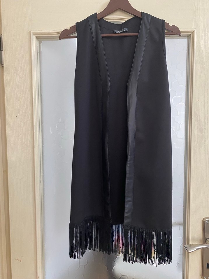 Siyah, kolsuz, uzun yelek, etek kısmı püskül detaylıdır. Sentetik kumaştan yapılmış, batik desenli ve düzenli kesimlidir. Ofis için bohem tarzda uygundur.
