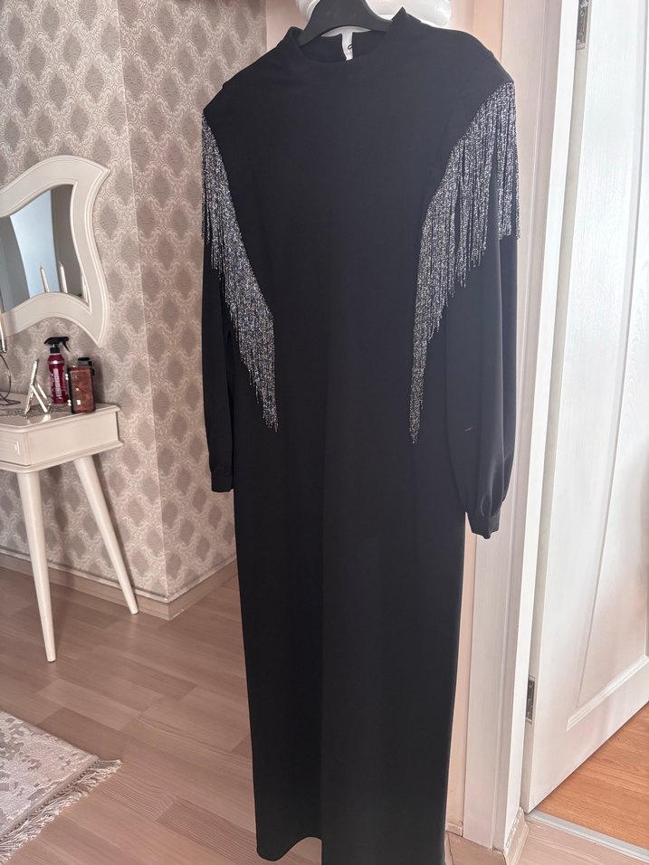 Siyah uzun kollu ve yüksek yakalı bu elbise, işleme ve püsküllerle gotik tarz sunar. Sentetik kumaştan, rahat kesimlidir.