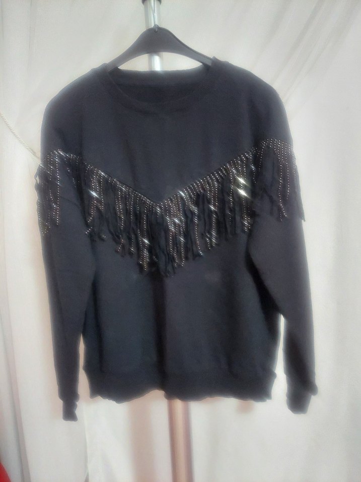 Siyah renkli, uzun kollu ve bisiklet yaka sweatshirt. Göğüs kısmında taşlı püskül detayları bulunur. pamuklu kumaştan, bol ve normal boyda, günlük kullanıma uygun goth tarzında.