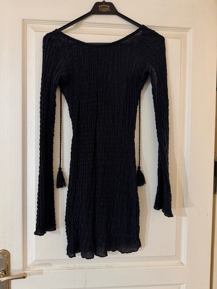 Bu siyah triko elbise, uzun kollu, tekne yaka ve püskül detaylı olup bohem ve gotik tarzı yansıtır. Günlük kullanım için uygundur.