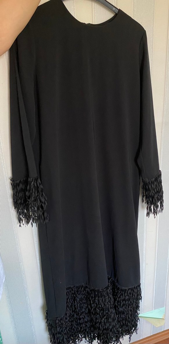 Püsküllü kolları ve etek ucu olan püsküllü uzun elbise. bol kesim, yumuşak kumaştan üretilmiştir. .