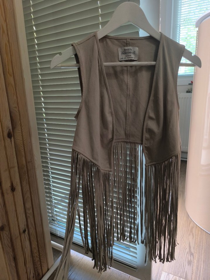 Bol kesim, kahverengi süet yelek, straplez yaka ve uzun püsküllerle bohem tarzını yansıtıyor. Günlük kullanıma uygun. renk bej , tertemiz ürün