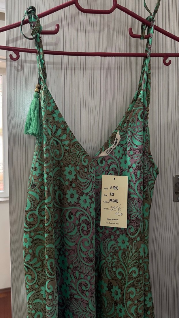 V yaka, kolsuz, bol kesim uzun elbise. Turkuaz baskılı deseni ve püskül detayı bulunur. Sentetik kumaştan, günlük kullanıma uygun.