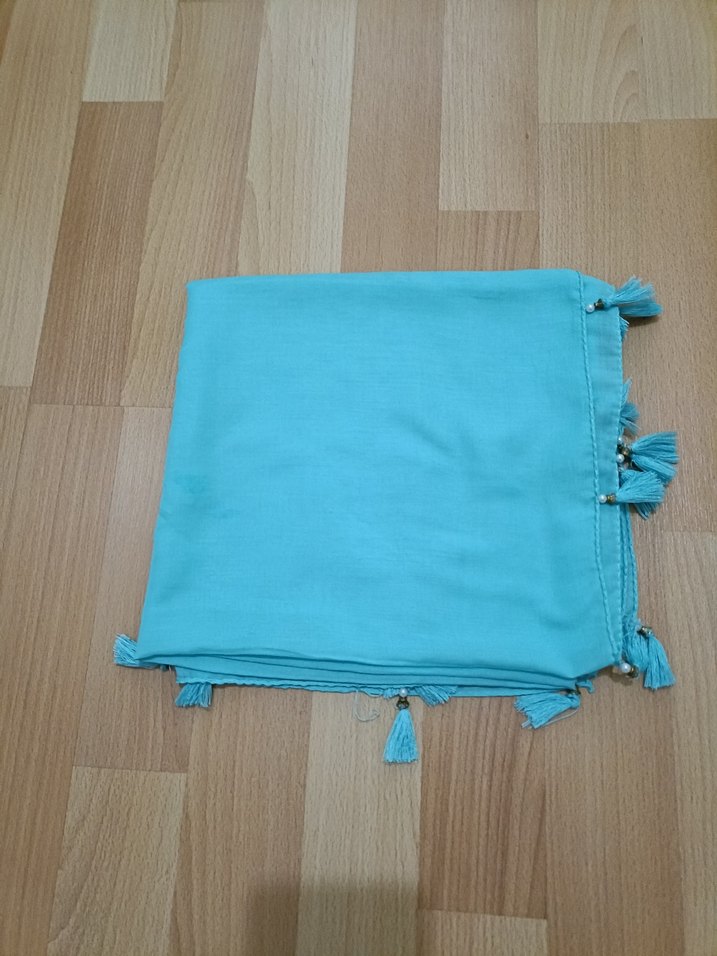 Bohem tarzı, pastel turkuaz renkte, püsküllü kadın fuları, yumuşak sentetik kumaştan üretilmiştir. Marka temsilidir.