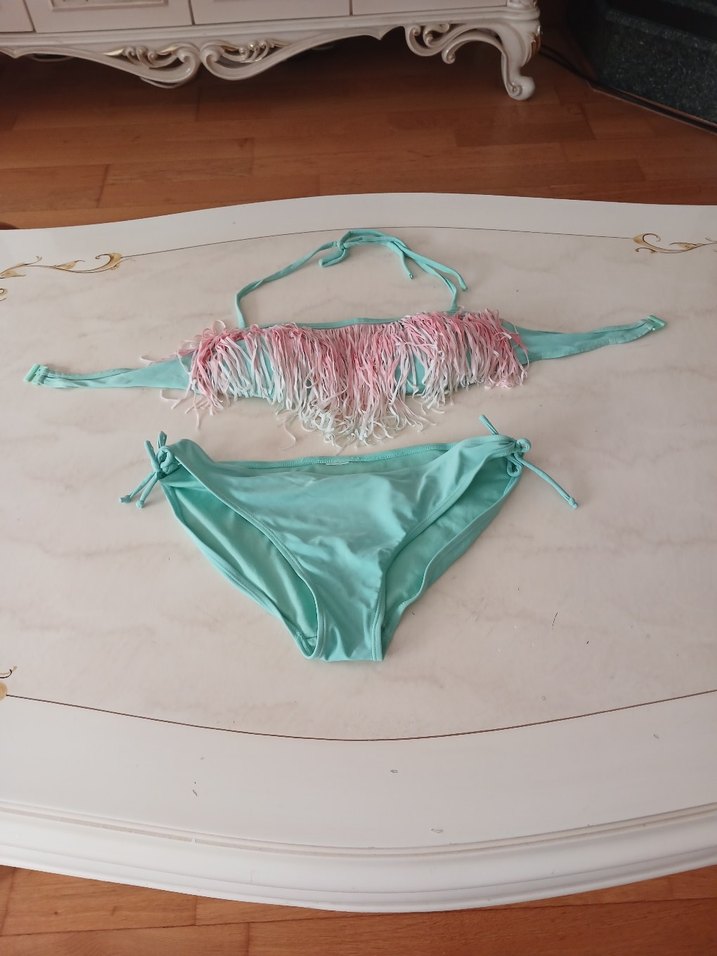 Fitted turkuaz bikini, askılı üst ve püsküllü detaylarla, pastel tonlarda batik desenli, bohem plaj stiline uygun.Bolero hediyedir