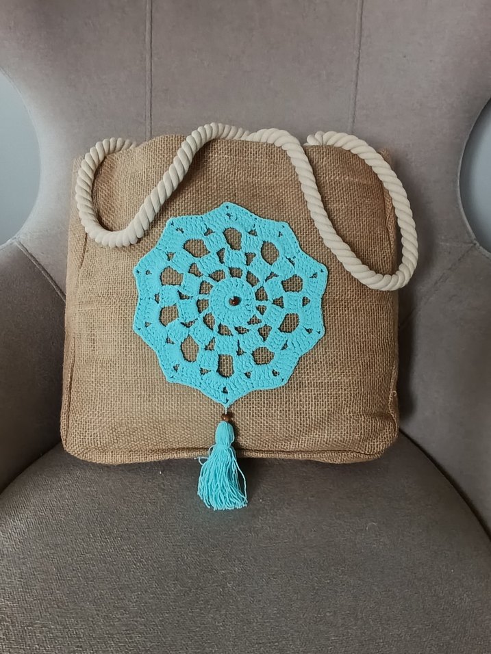 Pastel hem keten kumaştan turkuaz nakışlı örgü detaylı, püsküllü bohem tarzda kadın çantası. Kalın ip omuz askısı ve doğal dokuma tabanıyla günlük kullanıma uygun. 35x8x33 cm dir