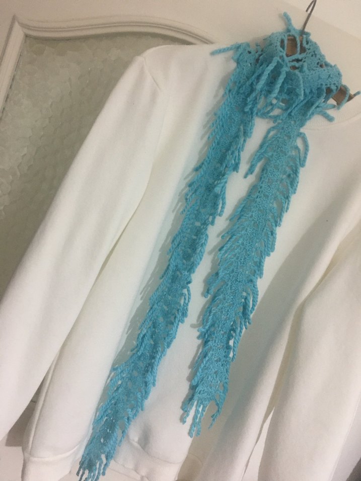 Turkuaz renkli, püsküllü örgü kadın şal, bohem tarzıyla retro ve hippie havası katıyor. Yumuşak ve hafif örgü rahatlık sağlar.